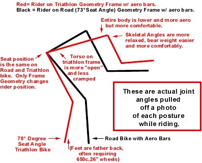 Great article. Only thing I would question is the “seat position the same” in the diagram. TT/triathlon frame geometry changes seat position more forward and riders generally sit on the nose of the saddle (even with road frame and clip-on aero bars).